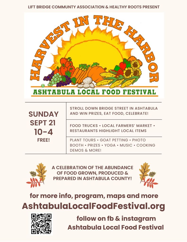 For more information: Contact: Gallo at the above address; Harbor Gardens, Ashtabula, OH 44004 440.969.7470, check out AshtabaulaLocalFoodFestival.org  Festival is co-hosted by Lift Bridge Community Association and Healthy Roots.